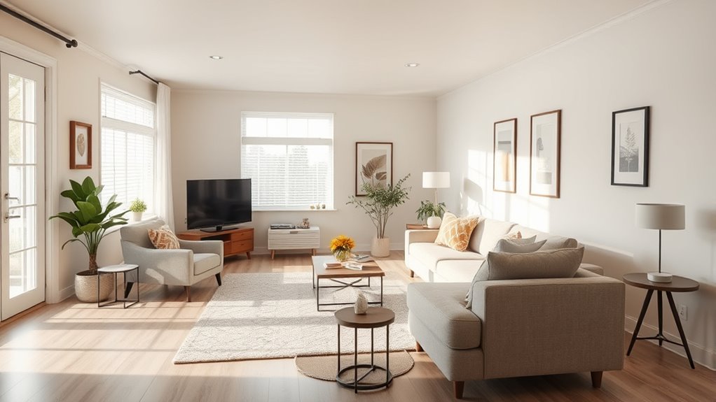 To reduce Alzheimer’s triggers at home, create a safe, clutter-free environment with proper lighting that minimizes shadows and guarantees easy navigation. Make switches accessible and use nightlights for nighttime safety. Keep pathways clear and organize belongings in familiar, labeled spots to prevent confusion. Simplify rooms, maintain consistent placement of essentials, and secure rugs to prevent falls. If you want practical tips to make your home safer and more supportive, keep exploring how to design an environment that promotes independence.