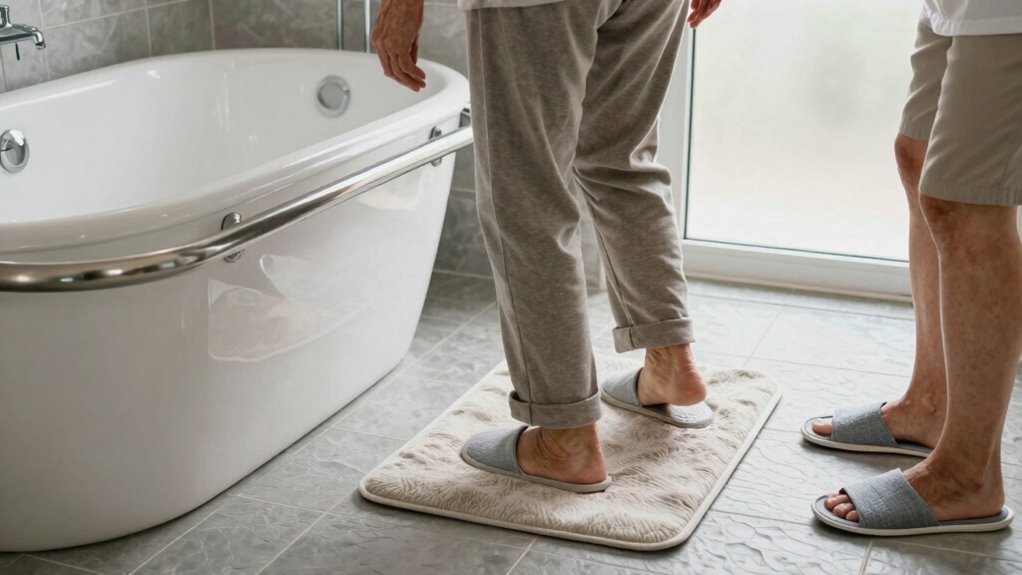Ever wonder what specific hazards in the bathroom can lead to falls? Bathtub hazards are a common risk, especially if the surface is uneven or has sharp edges. Slippery surfaces, like wet floors or shower stalls, considerably increase the chance of slipping. Soap, shampoo spills, and water splashes create slick areas that can catch you off guard. Clutter around the bathtub or on the bathroom floor can also cause trips. Without proper traction or secure grab bars, maintaining balance becomes harder, making falls more likely. Recognizing these hazards is the first step toward preventing accidents. Regularly checking for and addressing bathtub hazards and slippery surfaces can make your bathroom safer for everyone. Bathroom safety measures are essential for reducing fall risks and ensuring peace of mind. Additionally, incorporating fall prevention strategies such as non-slip mats and assistive devices can further enhance safety. Conducting a home safety assessment helps identify potential risks before an accident occurs. Implementing floor safety measures like proper lighting and securing loose rugs can also significantly lower the chances of falls.