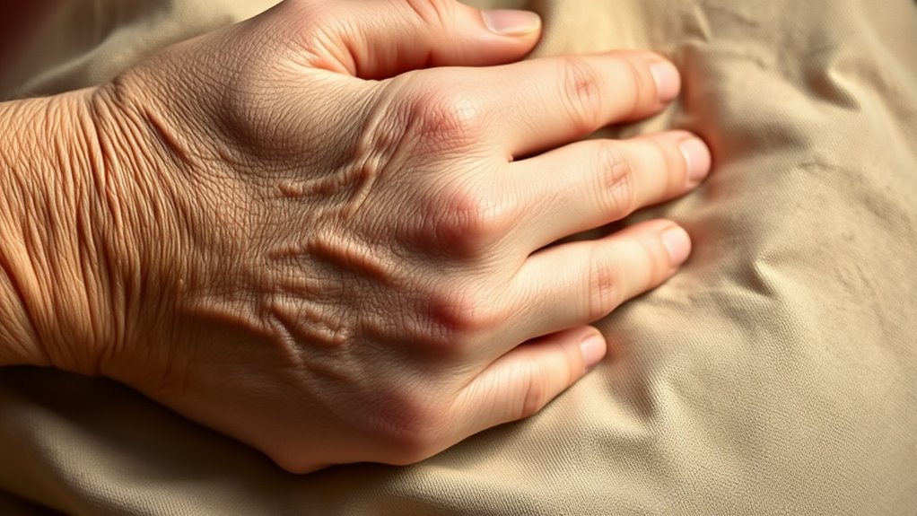Clenched hands often serve as a silent signal of discomfort or tension, especially in individuals with Alzheimer’s. You might notice their fingers tightly curled or fists clenched, even when they’re at rest. Look for persistent gripping or rigidity that doesn’t ease with relaxation. Tension indicators include knuckles turning white from pressure, stiff fingers that resist gentle movement, or a constant curl that doesn’t relax naturally. These signs suggest underlying discomfort or anxiety. Recognizing these cues early helps you understand their emotional state and allows you to intervene with gentle techniques. Pay attention to subtle changes in hand posture or grip strength, as these are key indicators of ongoing tension. Addressing these signs can help reduce stress and promote comfort.