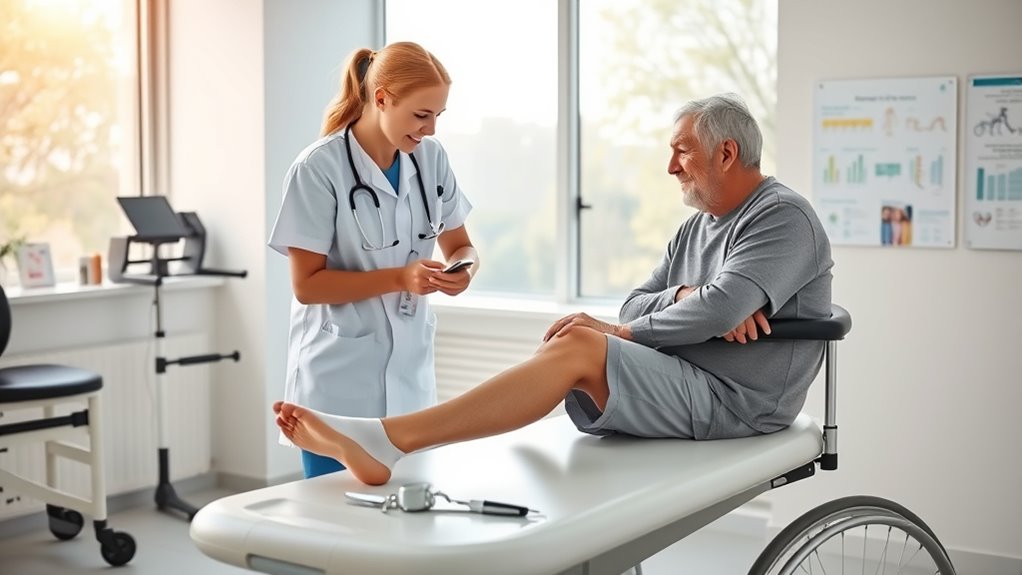 After identifying orthopedic risks in Parkinson’s patients, customizing physical therapy becomes essential to support joint and muscle health. You should focus on gentle, targeted exercises that improve flexibility, strength, and posture, reducing stiffness and imbalance. Incorporate low-impact activities like stretching, range-of-motion drills, and resistance training tailored to each patient’s abilities. Consistency is key—regular sessions help maintain mobility and prevent deterioration. Pay attention to patient feedback; modify exercises if they experience pain or fatigue. Educate patients on proper movement techniques to avoid strain and injury. Use assistive devices if needed, and ensure a safe environment for exercises. By personalizing therapy plans, you help your patients preserve function, reduce discomfort, and enhance their overall quality of life.