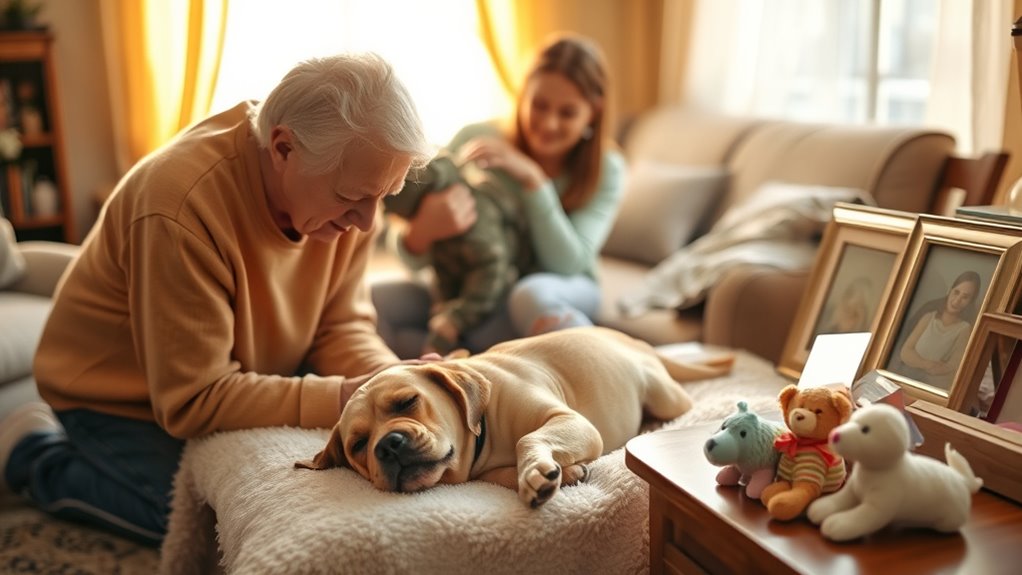 To help your family pet say goodbye, watch for signs they’re ready, like loss of interest or changes in breathing, and create a calm, soothing environment with soft bedding and gentle music. Offer comfort through touch, favorite treats, and familiar objects, while spending quality time together. Consult your vet about care options and respect your pet’s boundaries. Continuing with this approach can ease their passage and help your family find peace during this difficult time.