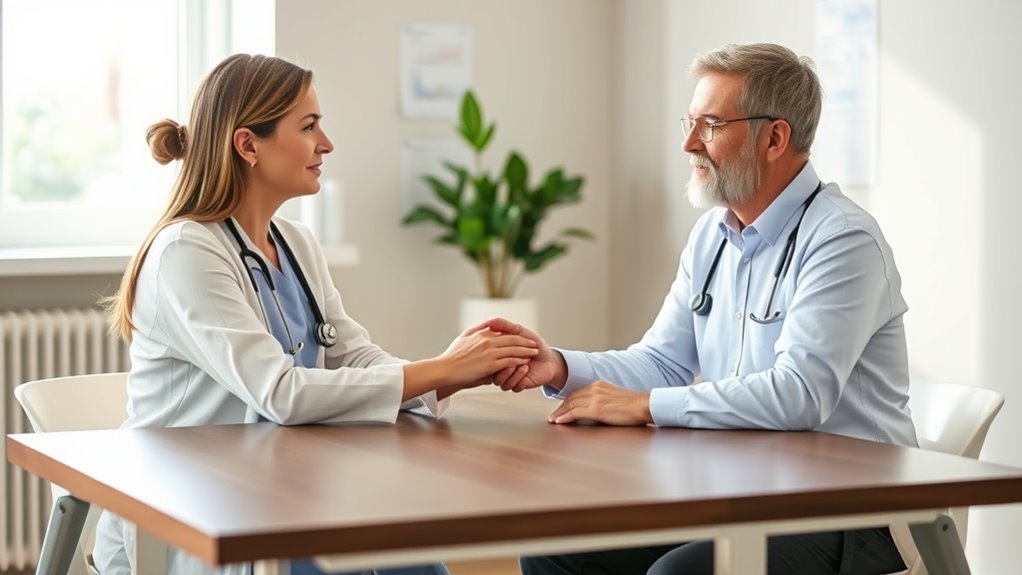 Expressing empathy sincerely means showing genuine compassion and understanding from the very first moment you open the conversation. When you start with empathy, you acknowledge the patient’s feelings and concerns, which helps build trust. Use warm, gentle language and make eye contact to convey your sincerity. Avoid rushing or appearing dismissive; instead, listen attentively and respond thoughtfully. Simple phrases like “I understand this is difficult” or “It’s okay to feel overwhelmed” validate their emotions. Your authentic concern creates a safe space, encouraging openness. Remember, genuine empathy isn’t just about words—it’s about your tone, body language, and presence. When you demonstrate heartfelt compassion, you set a compassionate tone that can ease the burden of tough conversations.