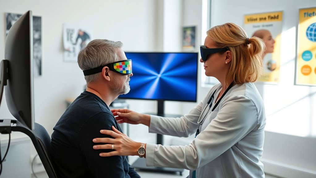 Enhancing visual awareness in vision neglect therapy relies heavily on visual feedback and computer-based training, which actively engage you in your recovery process. These techniques help you recognize neglected areas by providing immediate, clear responses to your actions. Computer programs can present targets or obstacles on screens, prompting you to focus on the neglected side. As you respond, the system offers real-time feedback, reinforcing awareness and encouraging attentional shifts. This interactive approach keeps you motivated and allows for tailored difficulty levels suited to your progress. By repeatedly practicing these tasks, you strengthen neural pathways responsible for visual attention. Over time, such training can markedly improve your ability to notice and respond to stimuli on your neglected side, enhancing overall visual awareness.