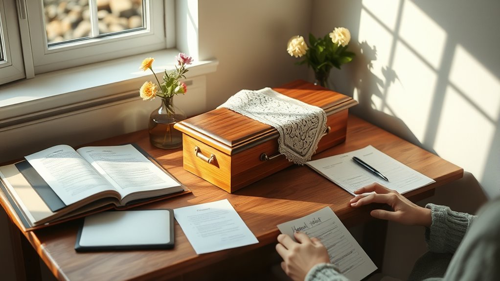 Ensuring proper documentation and legal paperwork is a crucial step in planning a home funeral, as it helps guarantee everything is handled smoothly and in accordance with the law. First, you’ll need to obtain the death certificate from the appropriate authorities, which officially records the death. Check your state or local regulations for specific requirements, such as notarized affidavits or permits. You’ll also need to notify the vital records office and arrange for transportation of the body, if necessary. Keep copies of all documents, including the death certificate, permits, and any affidavits, in a safe place. Staying organized and informed about legal requirements assures your home funeral proceeds without unnecessary delays or complications. This preparation provides peace of mind during a difficult time.