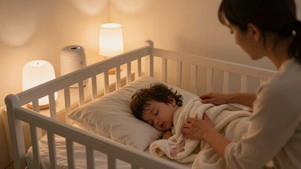 A consistent sleep schedule is key to preventing night wandering, and setting a regular bedtime helps your child’s body anticipate rest. By sticking to the same schedule, you reinforce healthy sleep habits and make sleep training easier. Incorporate calming bedtime stories to create a familiar routine that signals it’s time to wind down. When your child associates specific activities with bedtime, it helps them relax and segue smoothly into sleep. Avoid variability in bedtimes, even on weekends, to keep their internal clock steady. This consistency reduces the chances of night wandering caused by confusion or overtiredness. Over time, your child will develop a natural sleep rhythm, making bedtime less stressful and more predictable for both of you. Establishing a consistent sleep environment further supports this routine by making the space inviting and conducive to sleep. Creating a calm sleep environment with minimal distractions can enhance the effectiveness of the routine and help prevent disruptions during the night. Additionally, maintaining a quiet and dark room can enhance the effectiveness of the routine and help prevent disruptions during the night. Ensuring that the sleep environment aligns with effective sleep practices can further improve your child’s overall sleep quality. Implementing sleep-friendly lighting can also contribute to a more restful environment.