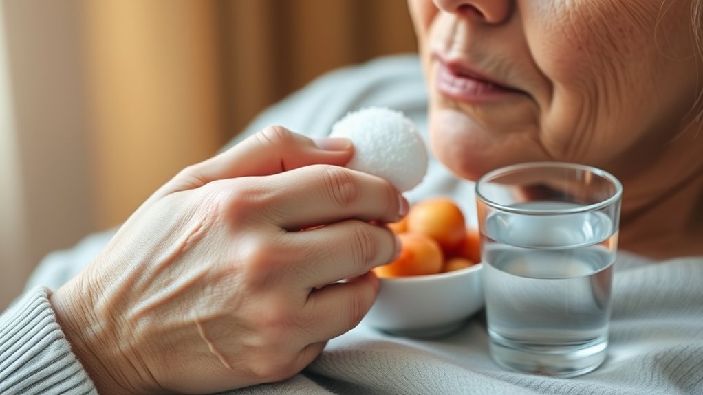 To manage dry mouth effectively, you should encourage the use of saliva substitutes and oral moisturizers regularly. Sipping water often helps, but avoid alcohol-based mouthwashes that can dry out your mouth further. Keep lips moist with lip balm and maintain good oral hygiene. If dryness persists, consult with healthcare providers for additional options like medicated rinses or specialized products to keep your mouth comfortable.