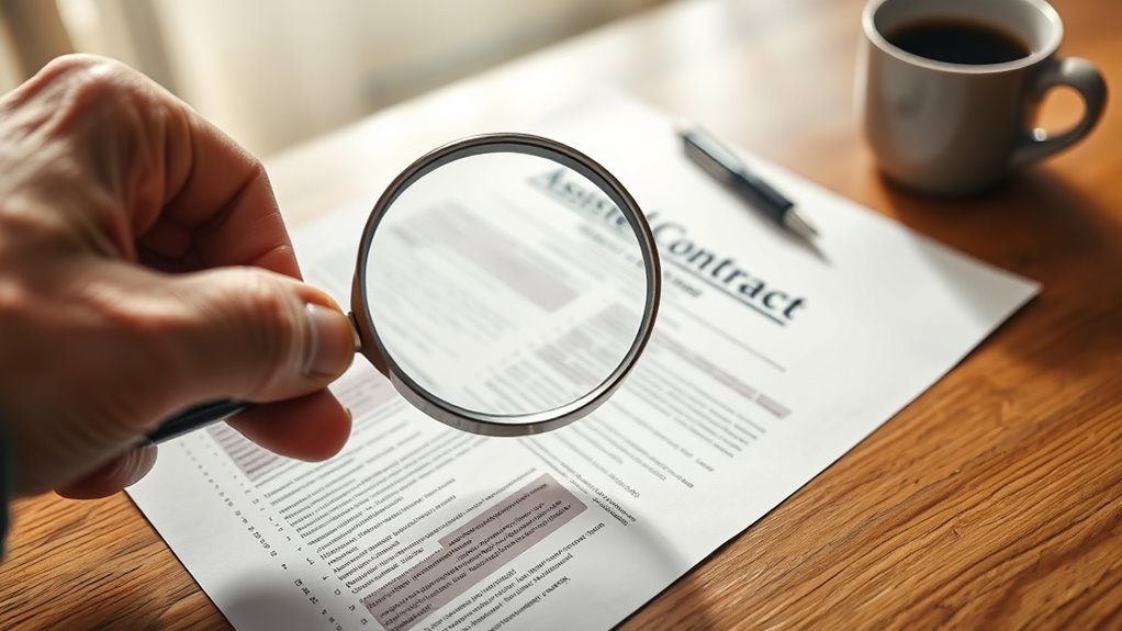 To understand assisted living contracts and fine print, review the payment options, including lump sums or monthly plans, and make certain they fit your budget. Pay close attention to exit clauses, penalties, and whether prepaid fees are refundable. Clarify rate changes over time and what services are included. Also, check the details about contract renewal, termination, and resident rights. Staying aware of these points helps you avoid surprises—continue to learn more about what to watch for.