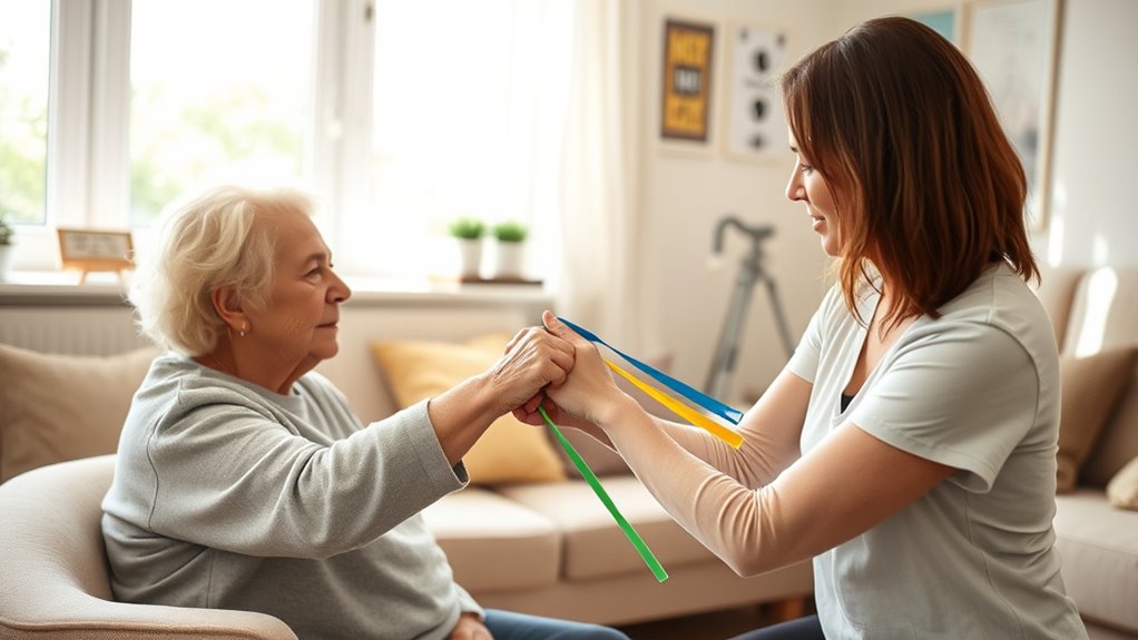 Supporting your loved one during stroke rehabilitation at home involves helping them regain independence through therapy, assistive devices, and environmental tweaks. Use properly fitted mobility aids like walkers or canes, and keep the environment safe by removing hazards and adding safety features. Encourage participation in daily activities and celebrate progress to boost their confidence. Combining emotional support with professional guidance helps improve recovery. Stay engaged—you’ll find helpful strategies to aid their journey every step of the way.