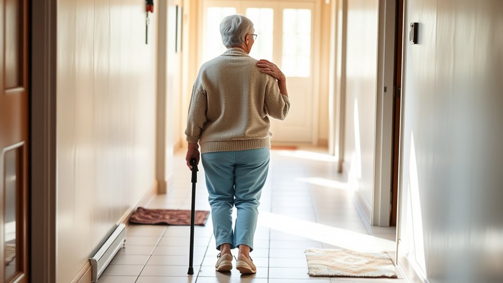 To manage freezing of gait, guarantee the environment is clear, well-lit, and free of clutter to help your loved one navigate safely. Use assistive devices like canes or walkers properly fitted for comfort and confidence. Incorporate routine cues such as rhythmic tapping or verbal prompts to initiate movement. Encouraging steady walking pace and environmental consistency reduces surprises that trigger freezing. Support your loved one with familiar cues and strategies—learning more can empower you both to handle episodes confidently.