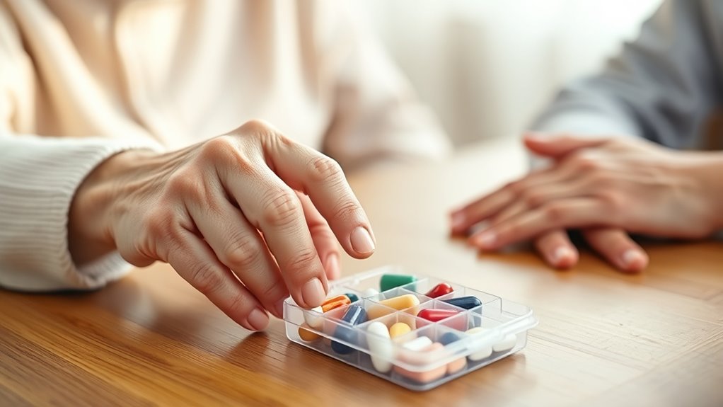 Ultimately, managing medication adherence in dementia patients requires a proactive approach. By investing in caregiver training and utilizing tools like pill organizers, you can considerably reduce the risk of missed doses and medication errors. This not only supports your loved one’s health but also provides you with confidence and peace of mind. Remember, consistent routines, proper education, and organized tools are your best allies in steering through the complexities of dementia medication management.