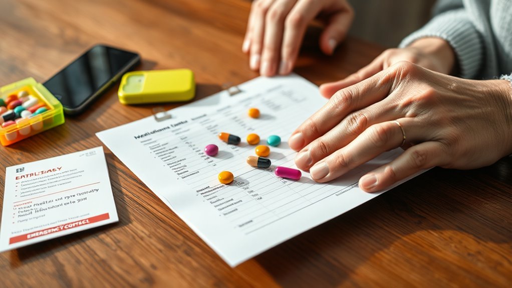 To create a medication list and emergency info for seniors, gather details on all prescriptions, over-the-counter drugs, vitamins, and supplements, including names, dosages, and prescribers. Don’t forget allergies, medical conditions, and emergency contacts. Keep this info accessible in your wallet, phone, or a secure app, and update it regularly. Carry a medical alert ID and develop a plan in case of emergencies. Continue exploring for expert tips to stay prepared and protected.