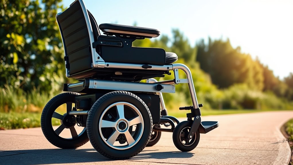 Ever wondered how some electric wheelchairs handle rough outdoor terrain with ease? It all comes down to terrain adaptability features. Look for all-terrain tires, like puncture-proof or inflatable types, which help navigate grass, gravel, and uneven surfaces smoothly. An adjustable suspension system or shock absorption is essential for comfort and stability on bumpy paths. Check the motor power and slope climbing capacity—ideally, the wheelchair should handle inclines of at least 12° to conquer hills and rugged outdoor routes. Larger wheels, 8 inches or more, provide better traction and a smoother ride across various terrains. Finally, safety features like electromagnetic brakes and anti-tip wheels are critical for maintaining stability and control outside, giving you confidence to explore different environments safely.