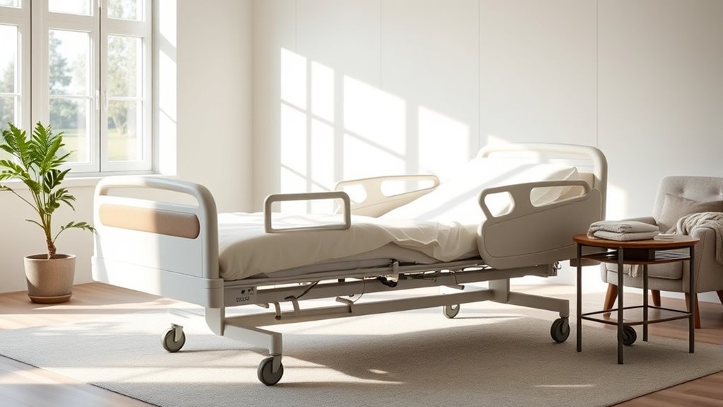 Have you considered how essential safety features are when selecting a hospital bed for home use? These features are key to prevent accidents and support stability. Lockable or foldable side rails help prevent falls and assist with transfers, offering peace of mind. Anti-tip mechanisms and a low center of gravity make the bed more stable, reducing the risk of tipping over. Emergency stop buttons and controls within easy reach enable quick responses during emergencies. Adjustable bed height minimizes fall hazards when getting in or out of bed, guaranteeing safer transfers. Additionally, pressure relief surfaces and secure mattress support help prevent pressure ulcers and keep patients stable. Prioritizing these safety features ensures the bed provides both protection and confidence for patients and caregivers alike.