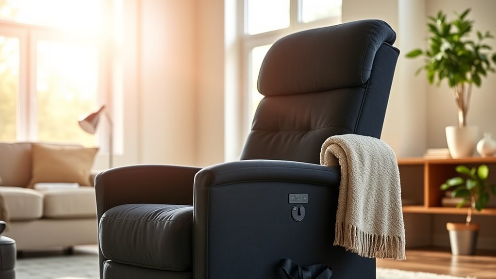 Selecting a power lift chair that’s easy for an elderly person to operate can make a significant difference in daily comfort and independence. I recommend choosing a chair with a control panel or remote featuring large, clearly labeled buttons—this makes operation straightforward and reduces confusion. Simpler, intuitive functions help prevent accidental adjustments and guarantee users feel confident using the chair. Features like one-touch reset buttons or preset positions allow for quick, effortless repositioning, especially for those with limited dexterity. For added accessibility, consider voice-activated or motorized controls if needed. Ultimately, reliable, quiet motors ensure smooth transitions between positions, fostering trust and comfort during daily use. Prioritizing ease of operation helps users feel more autonomous and reduces frustration.