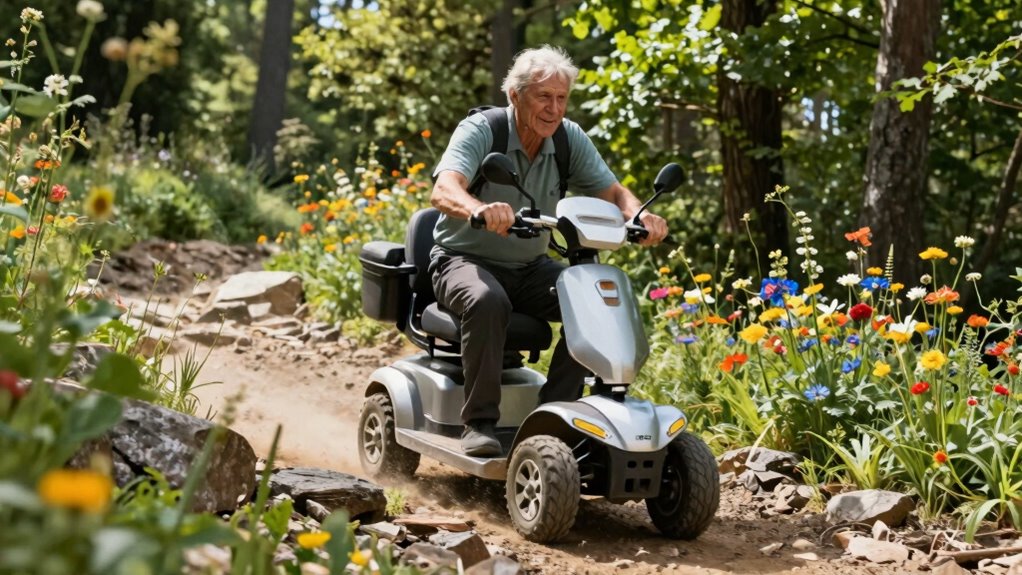 Moving across uneven terrain with a 4-wheel scooter requires careful attention to how smoothly it shifts between different surfaces. A scooter with large, rugged tires and reinforced suspension makes this changeover much easier, providing stability and comfort. Shock absorption features, like front and rear suspension systems, help absorb bumps and reduce jarring movements, making rides more comfortable. Adequate ground clearance, around 2.5 to 3.5 inches, prevents the scooter from snagging on obstacles and uneven ground. Safety features such as anti-tip wheels and a low center of gravity further improve stability during terrain changes. Additionally, intuitive controls and responsive steering enable seniors to navigate varied surfaces confidently, making transitions more seamless and safer. These factors combine to ensure a seamless, secure riding experience on uneven ground.