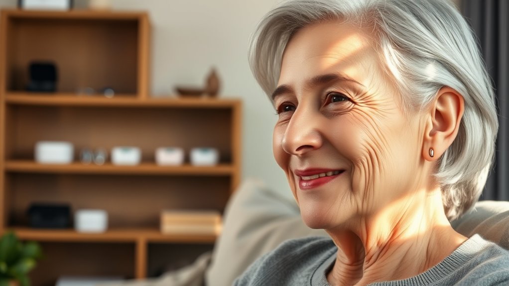 When selecting hearing aids for seniors, discreet design plays a crucial role in boosting confidence and encouraging consistent use. I look for devices that are nearly invisible when worn, like CIC or RIC styles, which fit snugly and reduce visibility. These small, compact options often come in skin-tone colors or low-profile designs, helping them blend seamlessly with natural ear contours. Lightweight materials and ergonomic shapes ensure comfort for all-day wear, preventing discomfort or protrusion. A discreet hearing aid minimizes the stigma linked to hearing loss, making users more comfortable and willing to wear them regularly. Ultimately, a discreet design not only enhances confidence but also promotes better hearing health through consistent use, which is essential for effective communication and quality of life.