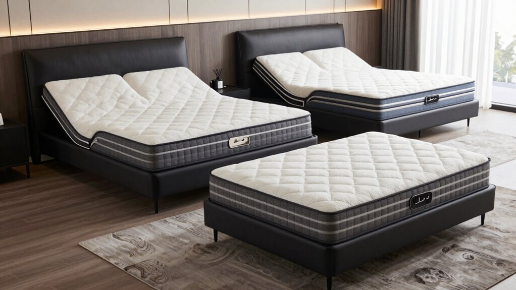 Choosing an adjustable bed base that works well with your mattress requires careful attention to compatibility features. First, make sure the base supports all mattress types, including memory foam, hybrid, latex, and spring, usually between 8 and 14 inches thick. Check that the frame is compatible with split mattresses, allowing each side to move independently for personalized comfort. It’s also important to verify the maximum weight capacity, which should support at least 750 pounds to handle different user weights and mattress types. Additionally, look for features like a retainer bar or mattress locking system to prevent shifting during adjustments. Finally, opt for a base that’s easy to set up and clearly specifies mattress compatibility for a seamless and secure fit.