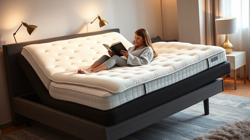 Choosing the right bed elevation angle is essential for back pain relief, as it directly affects spinal alignment and pressure distribution. I recommend setting the head elevation between 30° and 45°, which helps reduce strain and promotes proper posture. Elevating the legs to around 15° to 30° can alleviate lower back tension and improve circulation. Adjustable beds with multiple incline options let you customize these angles for maximum comfort. Be cautious of going beyond 60°, as it may cause neck and shoulder strain, or keeping angles too low, which might not provide enough relief. The ability to independently adjust head and foot angles allows for personalized positioning, ensuring you find the most effective setup for your back pain needs.