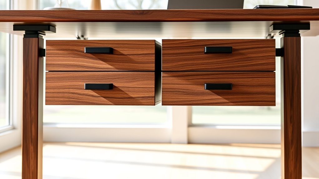 Think of drawers as the heartbeat of your desk—they do have weight limits. Usually, they can handle around 10 to 15 pounds per drawer, but it varies. Overloading them is like trying to carry a mountain—things could get shaky or stuck. Always check the manufacturer’s guidelines to keep your setup steady and safe. Trust me, respecting these limits keeps your workspace smooth and reliable.
