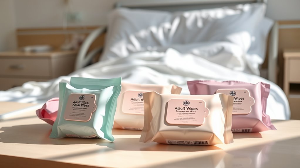 Because sensitive skin and allergies are common concerns for bedridden patients, it’s important to pay attention to the fragrance and allergen content in adult wipes. Fragrance-free wipes are usually the safest choice, especially for those with skin sensitivities or allergies, as they help prevent irritation. Scented wipes often contain artificial fragrances that can trigger allergic reactions or respiratory issues. To minimize risks, opt for hypoallergenic wipes that avoid common allergens like preservatives, dyes, or perfumes. Before using wipes with added fragrances or allergens, testing on a small skin area is wise. Always review the ingredient list carefully, looking out for potential irritants such as lanolin, perfumes, or preservatives. Being vigilant helps protect your loved one’s skin and overall health.