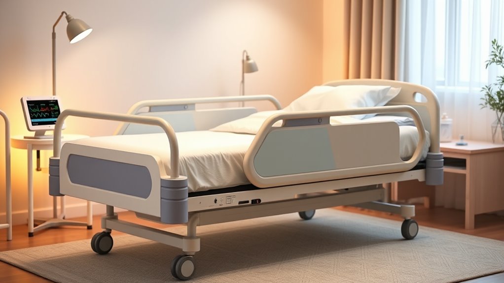 Think of these beds as the sturdy oak trees of home medical care—they’re built to support various weights. Most models are designed with different weight capacities, often ranging from 300 to over 600 pounds, ensuring safety and comfort. I always recommend checking each bed’s specifications carefully to find the best fit for your needs. Rest assured, many affordable options are made to accommodate diverse weight capacities, making care accessible for everyone.
