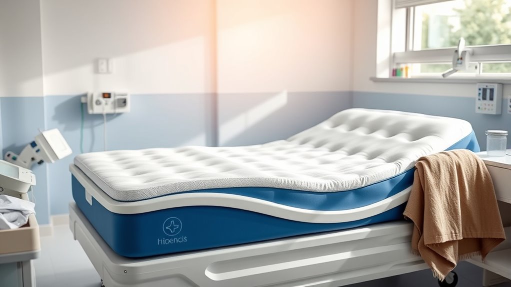 If you’re looking for the best alternating pressure mattresses that promote healing and comfort for bed sore prevention, I recommend exploring options with advanced pressure redistribution, adjustable cycles, and quiet operation. Many models feature waterproof covers, easy-to-use controls, and durable materials to suit long-term use. Their unique designs help reduce pressure points, improve circulation, and prevent sore development. Keep going, and you’ll discover detailed features and expert tips to find the perfect fit for your needs.