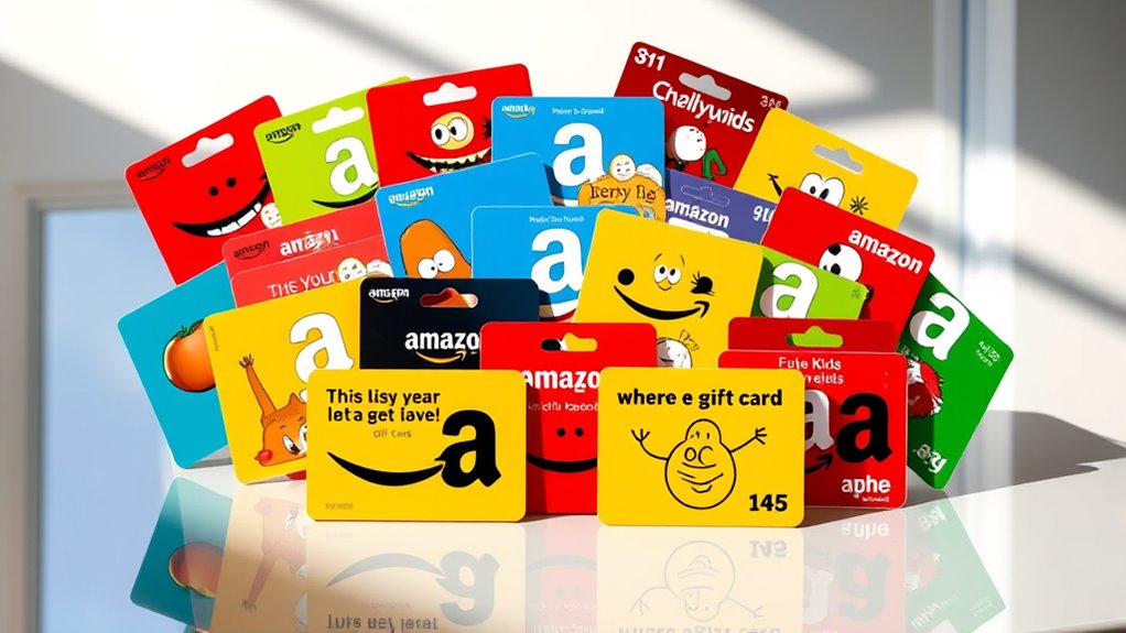 Unique artwork is the heart of funny Amazon e-gift cards, capturing attention instantly with humorous characters, clever puns, or witty illustrations. These designs use playful fonts and bright colors that amplify the comedic vibe and make the gift memorable. Personalization options allow you to add custom messages or images, enhancing the humor and giving a personal touch. Distinctive artwork helps the gift stand out from traditional cards, perfect for recipients with a good sense of humor. High-quality, creative illustrations are carefully crafted to guarantee clarity and visual appeal whether viewed digitally or in print. When choosing a funny gift card, look for designs that balance humor with vibrant visuals—this ensures your gift not only makes them smile but also leaves a lasting impression.