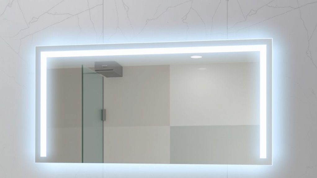 Lighting customization is a key factor to think about when selecting a 48-inch anti-fog LED bathroom mirror, as it directly impacts your grooming and aesthetic routines. Adjustable color temperature options let you switch between warm, natural, and cool lighting, tailoring the ambiance to your needs. Dimmable brightness controls give you precise control over illumination levels, making tasks like makeup application or shaving easier. Some mirrors feature memory functions that save your preferred settings for quick access later. Separate control buttons for front and back lighting provide added flexibility, letting you customize each side independently. Additionally, stepless dimming and multiple lighting modes enable seamless adjustments, ensuring you have the perfect lighting environment for every grooming or beauty session.