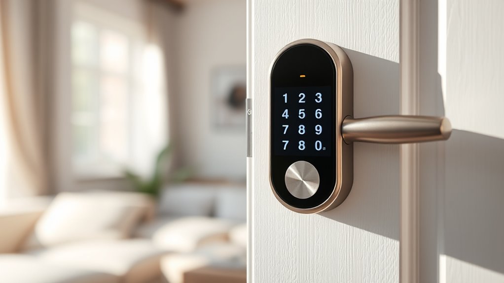 Safety is a top concern when selecting anti-wandering door locks, especially in households with children and pets. Childproof and pet-proof locks help prevent accidental escapes, reducing the risk of injuries. Many locks feature self-locking mechanisms and tamper-resistant designs that kids and pets can’t easily open or disable. Quick-release or emergency access options are also important, allowing caregivers to respond swiftly in urgent situations. Durable, shatter-resistant materials guarantee that curious children or pets can’t break or bypass the lock. Proper installation at accessible heights is essential, making it difficult for children and pets to reach or manipulate the devices. Prioritizing these safety features can provide peace of mind, knowing your loved ones are protected without compromising accessibility for emergencies.