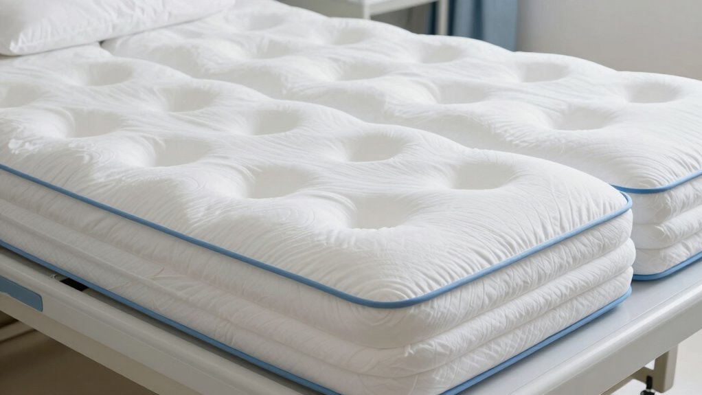Ensuring the mattress fits the hospital bed properly is essential for patient safety and comfort. I always check that the mattress dimensions match the bed frame, such as 42″ x 80″ for standard models or wider for bariatric beds. Picking a size that offers enough surface area helps distribute weight evenly and reduces pressure points, which is vital for patient well-being. I also verify that the mattress’s thickness and support layers align with the bed’s height to ensure proper positioning. If the bed is adjustable, I confirm the mattress size accommodates its movement and elevation features. Additionally, I choose sizes with non-slip edges and a snug fit to prevent gaps or shifting, maximizing safety during use.