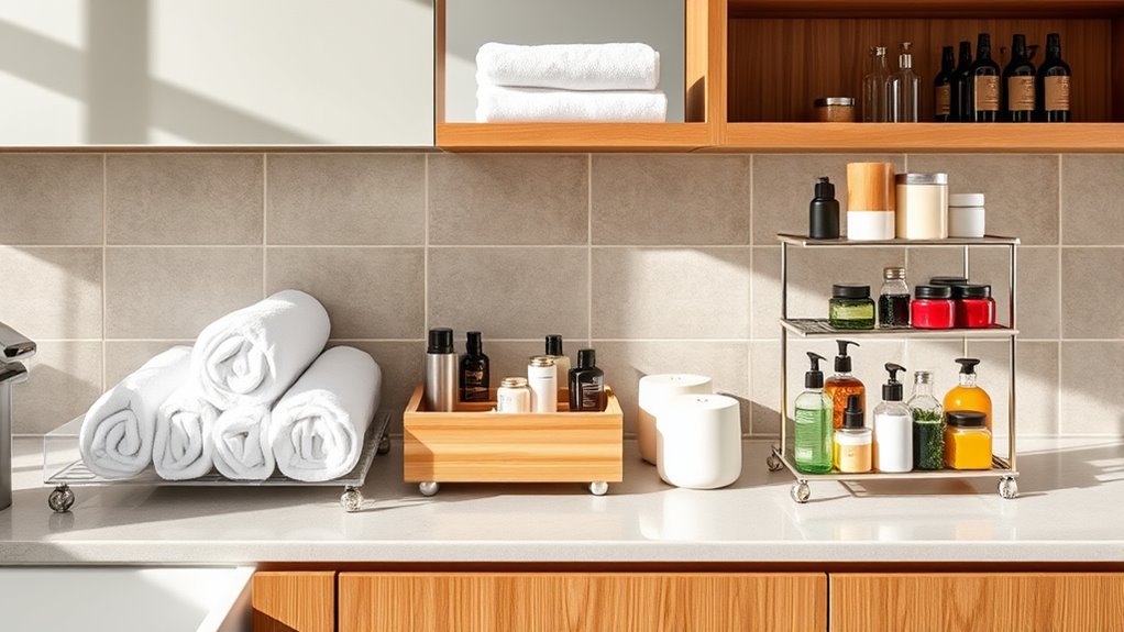 To prevent mold and mildew on your organizers, I recommend keeping them dry and well-ventilated. I wipe them down regularly with a mixture of water and vinegar, which kills mold spores. I also avoid overstuffing shelves to improve airflow. Additionally, I use silica gel packets or moisture absorbers inside cabinets. These simple steps keep my organizers clean, dry, and mold-free, ensuring a fresh bathroom environment.