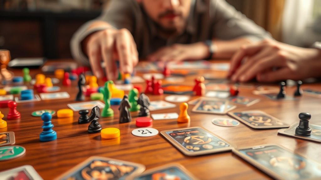 Understanding the strategic depth of a board game helps guarantee it matches your skill level and keeps you engaged. Strategic depth involves complex decision-making with multiple paths to victory, encouraging you to think several moves ahead. Games with high depth often feature mechanics like resource management, area control, or pattern building, demanding careful planning and adaptability. The depth can be measured by the variety of strategies available and how much your choices impact the outcome, not just luck. It’s essential to find a game whose complexity aligns with your experience—challenging enough for seasoned players but not overwhelming for beginners. Incorporating asymmetric roles or modular components can also boost strategic depth by offering diverse tactics and personalized approaches, enriching your gameplay experience.