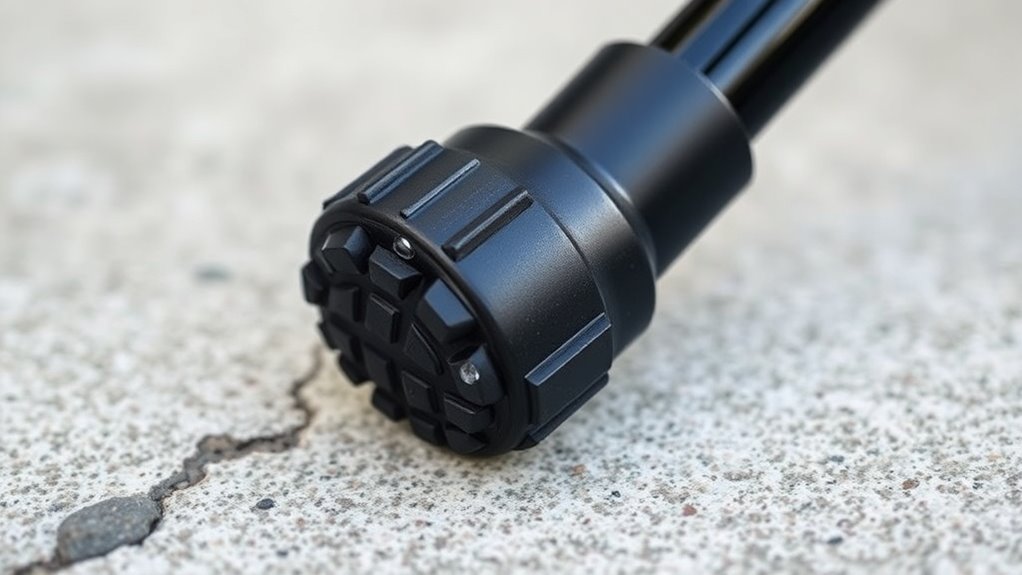 A key factor in selecting effective cane tips is their traction and grip, which directly impact stability and safety. High-quality rubber tips provide superior traction by gripping surfaces like tile, wood, gravel, and grass. Anti-slip patterns and textured surfaces further reduce the risk of slipping during use, especially on wet or uneven terrains. Non-skid rubber bases help prevent the cane from sliding, offering added stability. Enhanced grip and traction are essential for maintaining balance and preventing falls, particularly in challenging conditions. Choosing cane tips with reinforced, durable rubber ensures consistent performance over time, giving you confidence with every step. Prioritizing traction and grip helps you stay steady and reduces the likelihood of accidents, making your cane safer and more reliable.