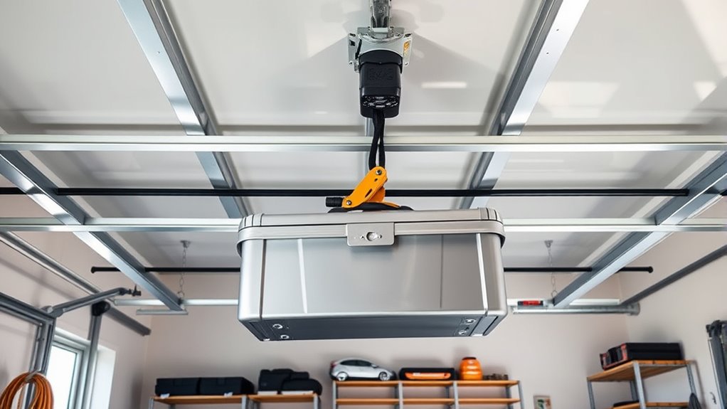 Ceiling lifts for home use include safety features like secure harnesses, overload protection, and smooth, controlled movement to prevent accidents. Many models have emergency stop buttons and backup batteries, ensuring safety even during power outages. I always look for lifts with reliable locking mechanisms and sturdy rails to keep items stable. These features give me peace of mind, knowing that lifting heavy items is safer for both me and my loved ones.