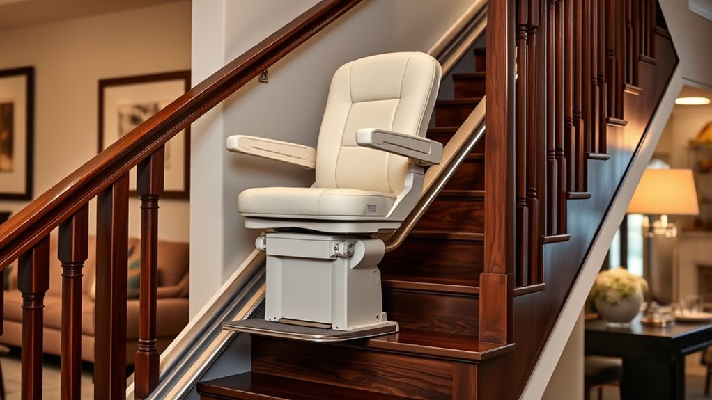 Choosing the right chair lift involves more than just features; you also need to consider installation requirements. First, determine if you can install the lift yourself or if you’ll need a professional. Check the track length to ensure it matches your staircase’s dimensions for a secure fit. Make sure the power source is compatible, and see if a dedicated outlet is necessary. Assess whether the mounting hardware works with your staircase material—be it wood, concrete, or metal railings. Additionally, verify that the installation complies with local safety standards and building codes. Proper installation is vital for safety and longevity, so don’t overlook these factors. Taking the time to review these requirements helps ensure your stair lift operates smoothly and safely in your home.