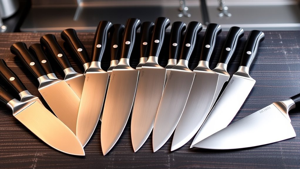 A well-rounded chef knife set offers more than just sharpness; it provides the versatility needed to handle a variety of ingredients and tasks efficiently. Including different blades—such as chef’s knives, Santoku, utility, paring, and bread knives—ensures you’re prepared for any culinary challenge. The range of blade sizes and shapes allows for precise slicing, chopping, and detailed work, whether you’re dealing with delicate herbs or dense meats. A thorough set streamlines your workflow by reducing the need for extra tools, saving time and effort. Versatility is especially vital in professional kitchens where adaptability is key. When choosing a set, look for diverse blade types and lengths that suit your cooking style and ingredient variety, making your kitchen both efficient and flexible.