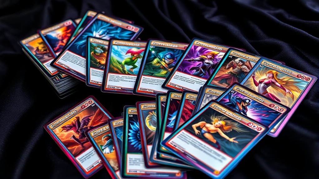 Card rarity and value are essential factors that can greatly influence your overall collection and its potential worth. Rarity levels like common, uncommon, rare, and ultra-rare directly impact a card’s desirability and market price. Limited-edition or special foil cards tend to fetch higher prices due to their scarcity and collectibility. Unique or hard-to-find cards can considerably boost the overall value of your collection or set. Rarity is usually indicated by symbols, holographic features, or numbering, helping collectors easily identify rare cards. Keep in mind, a card’s value isn’t solely determined by rarity; condition, demand, and how it fits into gameplay or set completion also play important roles. Balancing these factors helps you make smarter choices when building your collection.
