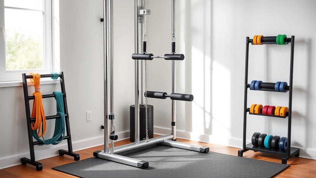 Choosing the right resistance range is essential for guaranteeing your compact cable home gym meets your strength training needs without overwhelming your space. Resistance options typically vary from as low as 20 lbs to over 280 lbs, making it easy to find a system suited for beginners and advanced users alike. Adjustable resistance settings allow you to progress gradually and customize workouts based on your goals and capabilities. Many models feature multiple resistance levels or incremental adjustments, giving you precise control over exercise intensity. The inclusion of high and low pulley stations broadens the resistance spectrum, supporting a variety of low-impact exercises. To guarantee safety and effectiveness, look for systems with clearly labeled resistance options that are easy to adjust during workouts.