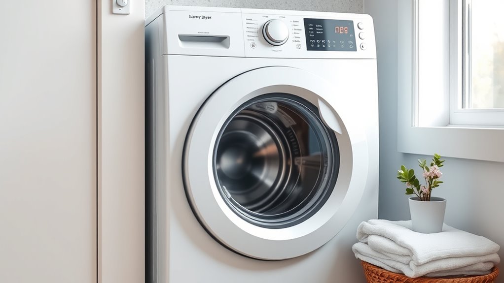 To keep my compact washer-dryer combo running smoothly, I regularly clean the lint filter and check hoses for leaks or blockages. I also run an empty hot wash every few months to clear out residue and prevent odors. Avoid overloading it, and follow the manufacturer’s maintenance guidelines. Doing these simple steps helps make certain my unit stays efficient, odor-free, and lasts longer.