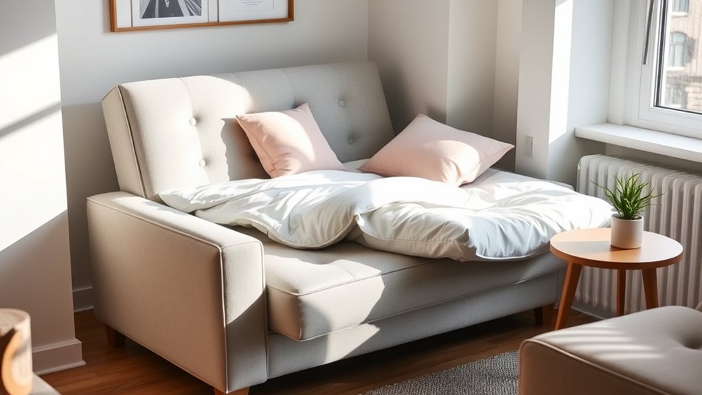 Choosing a convertible chair bed that offers versatile use is essential for maximizing small space functionality. I look for designs with multiple configurations, like sofa, bed, or lounge modes, to get the most out of limited areas. Features such as adjustable backrests and foldable frames make transforming the furniture quick and effortless, so I can switch from seating to sleeping without hassle. Multi-purpose designs are especially practical—they serve as guest beds, daily seating, or relaxing lounges, reducing the need for extra furniture. Compact, foldable, or vacuum-packed models are perfect for small spaces since I can easily store or move them when not in use. The ability to switch functions swiftly and without tools makes these beds highly practical, ensuring I maximize every inch of my space.