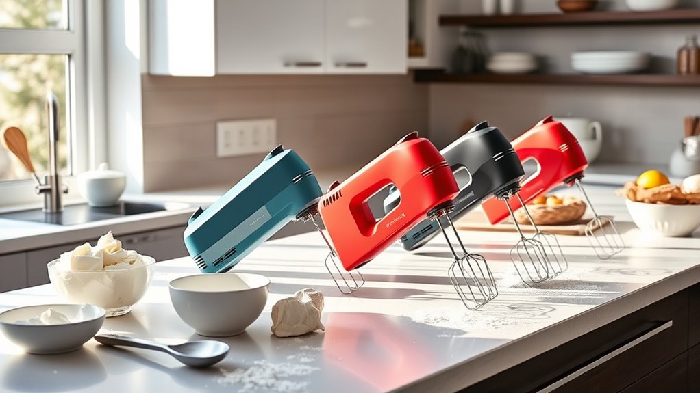 If you’re looking for the best cordless hand mixers in 2025, I’ve got you covered. These models combine powerful, adjustable speeds, sleek designs, and long-lasting batteries to make baking easier and more flexible. With features like digital displays, versatile attachments, and compact storage, they’re perfect for quick tasks and on-the-go baking. Curious? Keep looking, and you’ll discover the top options that’ll help you whip, beat, and mix with confidence.