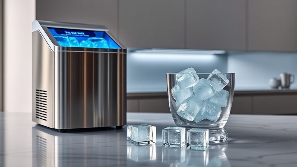 Maintaining a countertop ice maker that produces over 50 pounds of ice daily is easier when the unit is designed with user-friendly features. I look for models with automatic self-cleaning cycles, which help keep the machine fresh and odor-free without extra effort. Removable water tanks and ice baskets make cleaning and refilling straightforward, saving me time. Clear indicator lights for low water, full ice, or cleaning alerts simplify ongoing maintenance, so I know when to act. Durability matters too; I prefer units with corrosion-resistant materials like stainless steel, which are easier to wipe down and last longer. Finally, straightforward access points and minimal components make routine cleaning hassle-free, ensuring my ice maker stays in top shape with minimal effort.