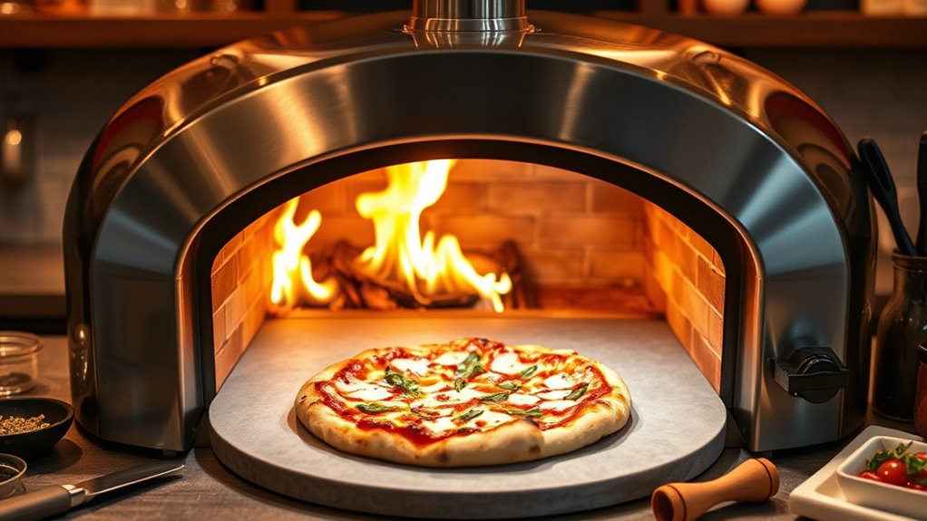 Safety features are vital to guarantee my counter pizza oven operates securely, especially at temperatures exceeding 800°C. Overheat protection, cool-touch handles, and automatic shut-off prevent accidents and ensure safe use during intense baking. Double-paned viewing windows and insulated doors minimize heat loss and protect my hands from burns while I monitor cooking progress. Precise temperature controls and built-in thermometers help prevent overheating, maintaining consistent and safe operation. Non-slip suction cups or stable bases keep the oven steady on my countertop, reducing the risk of tipping or movement. Clear safety instructions and warning labels are indispensable for informing me about high-temperature risks and proper handling procedures. Altogether, these features provide peace of mind and make high-temperature pizza baking safer and more manageable.