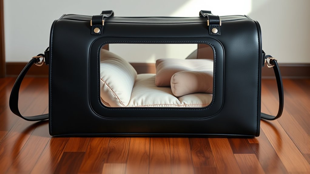 I know the fear of your pet escaping, so I prioritize security in design. These carriers include secure zippers, sturdy locking mechanisms, and reinforced mesh panels that prevent escapes without sacrificing style. The combination of durable materials and thoughtful features gives you peace of mind, knowing your furry friend stays safe and snug. After all, safety shouldn’t compromise elegance—your pet deserves both.