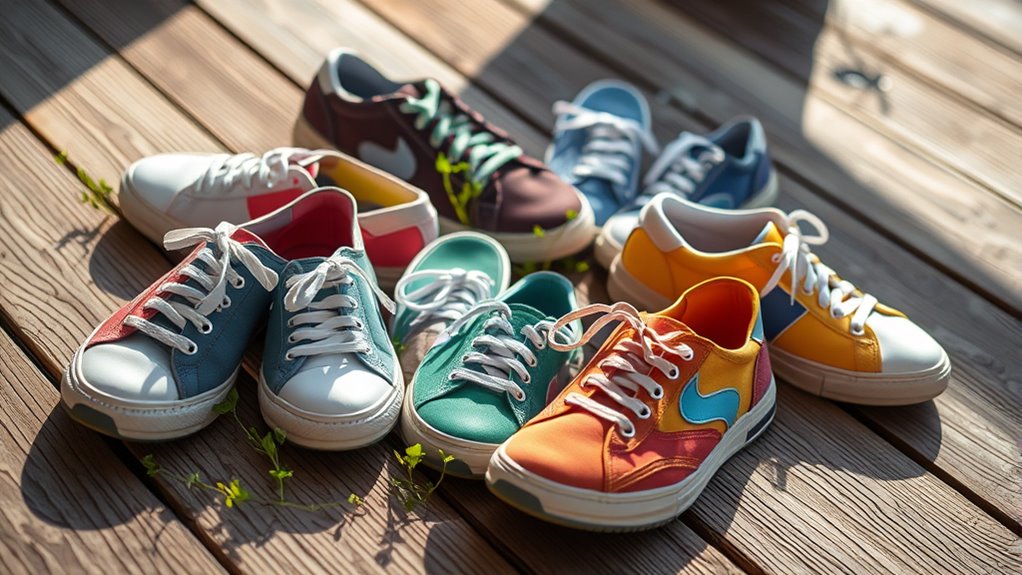 How can I make a more sustainable choice with my sneakers? One way is to look for eco-friendly options that incorporate recycled materials, like plastic bottles or rubber, which help reduce waste. Many brands now use post-consumer recycled content in various components, promoting a more sustainable approach. I also love exploring upcycling options; repurposing or repairing my sneakers can extend their lifespan and minimize new production. Some brands even design sneakers with modular parts that are easier to recycle or upcycle at the end of their life. By choosing sneakers made from recycled or upcycled materials, I’m supporting waste reduction and encouraging circular fashion practices. It’s a small step that makes a big difference!