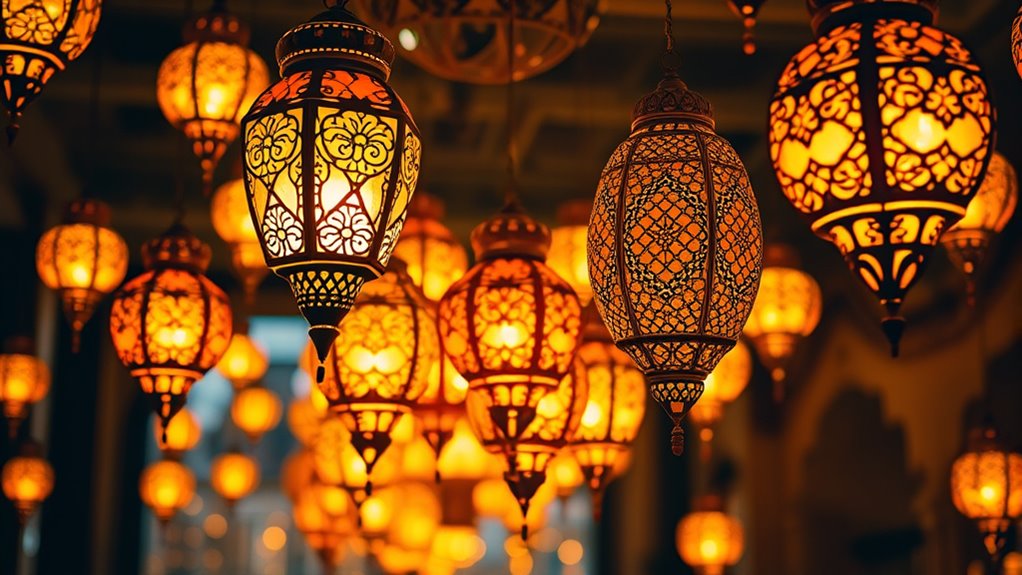 Eid decorative lanterns can truly elevate the festive spirit of your celebrations. When I choose lanterns, I always consider intricate designs that highlight cultural motifs, like moon and star patterns, which resonate with the occasion’s spirit. I prefer materials such as metal and glass; they not only look stunning but also guarantee durability for both indoor and outdoor use. Features like cut-out designs are a must for me, as they cast beautiful light patterns that create a mesmerizing ambiance. I also think about colors—gold and vibrant hues enhance the decor theme perfectly. Finally, I guarantee the size and scale fit my display area, whether on tables, hanging from ceilings, or outdoors, to create a harmonious look.