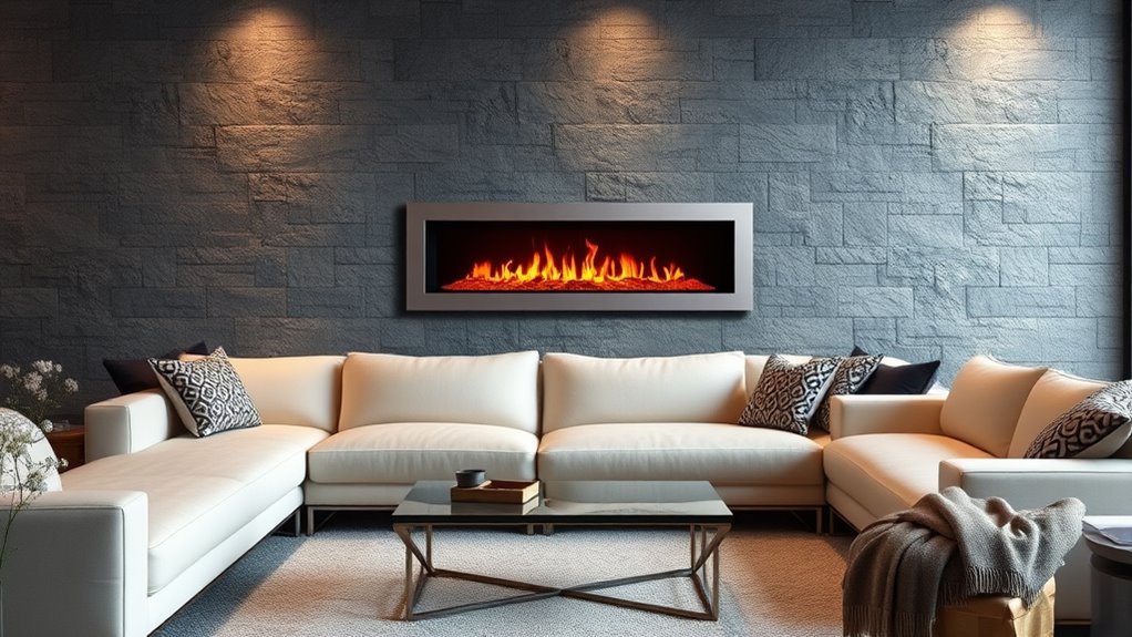 Safety features are vital considerations when selecting an electric fireplace, as they help prevent accidents and guarantee peace of mind. I look for models with overheat protection that automatically shut off if temperatures get too high, ensuring safe operation. A safety shut-off or auto-heat kill function is also indispensable to prevent fire hazards. I prefer fireplaces with cool-to-touch sides and back, minimizing burn risks during use. Checking for safety certifications like ETL or UL approval reassures me that the unit meets strict safety standards. Additionally, I consider models with tip-over or stability features, such as wide legs or secure mounting options, to prevent accidents. Prioritizing these safety features helps create a cozy space without compromising safety.