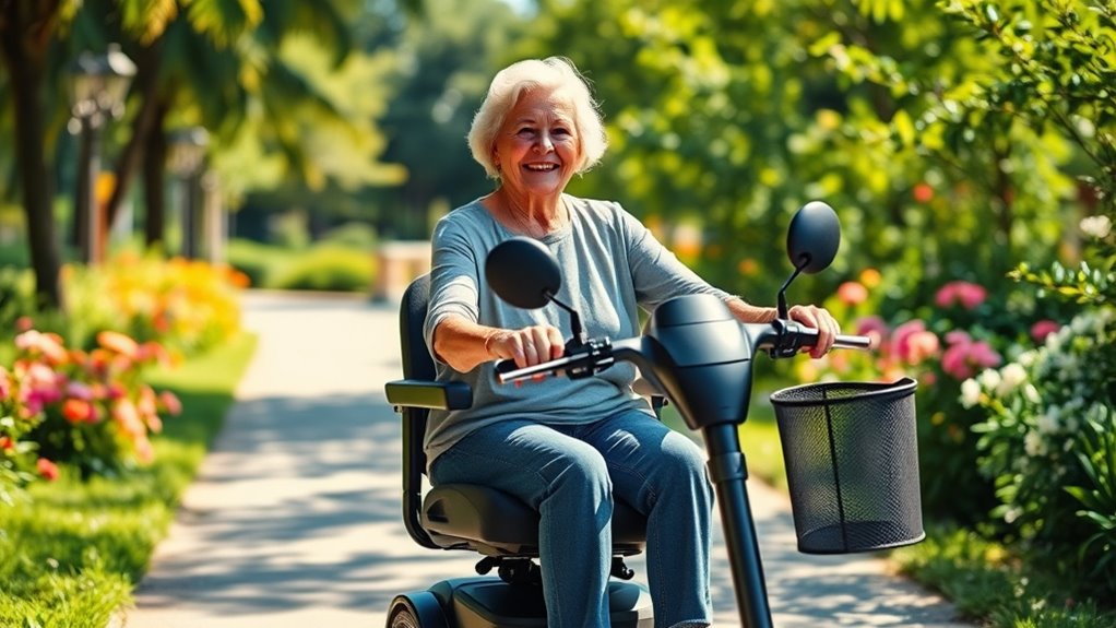 When choosing an electric mobility scooter for seniors, comfort and adjustability are essential to guarantee a pleasant and secure ride. I look for scooters with adjustable seats, armrests, and footrests so I can customize my seating for long trips. Swiveling and height-adjustable seats make transfers easier and help maintain good posture. The ability to modify the tiller or handlebar height reduces strain and ensures comfortable steering. Features like shock absorption and cushioned seats improve ride smoothness, preventing fatigue during extended use. Additionally, easy-to-use controls with adjustable speed settings allow me to operate the scooter confidently and comfortably. These adjustments make a significant difference in my overall experience, providing a tailored ride that adapts to my needs.