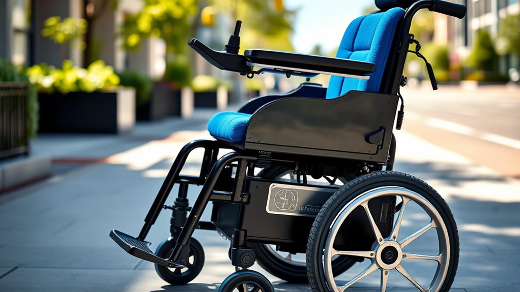 A high-quality battery can substantially enhance your electric wheelchair’s performance, especially when shopping under $1000. I look for batteries with at least 12Ah capacity, which typically provide a travel range of around 15 miles per charge, making sure you won’t need to recharge as often. Lithium batteries are my top choice because they’re lighter, safer, and easier to maintain than traditional lead-acid options. Fast-charging batteries that take 3-4 hours are a game-changer, minimizing downtime and allowing quick returns to mobility. Removable batteries add convenience, especially if accessing charging points is limited. Ultimately, I consider battery lifespan and warranty coverage to ensure long-term reliability and value. A dependable battery truly makes a significant difference in your daily comfort and independence.