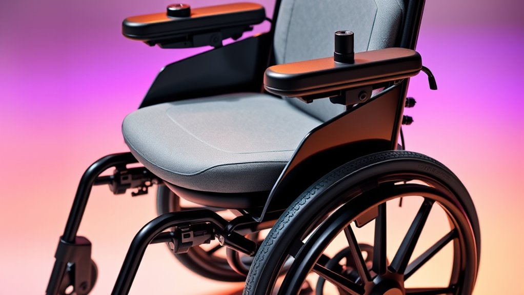 Choosing the right control options is essential when selecting an electric wheelchair under $1500, as they directly impact how easily and comfortably you can operate your device. Most models feature joystick controls with 360° movement, making navigation smooth and intuitive. Many wheelchairs include adjustable speed settings, typically with 3 to 5 levels, so you can tailor your ride to your comfort and needs. Reversible or removable control panels are common, allowing for left- or right-handed operation. Safety is also prioritized, with features like electromagnetic brakes and anti-tip wheels to ensure secure use. These control systems are designed to be straightforward, with simple interfaces that are accessible for seniors or users with limited mobility, making maneuvering less stressful and more reliable.